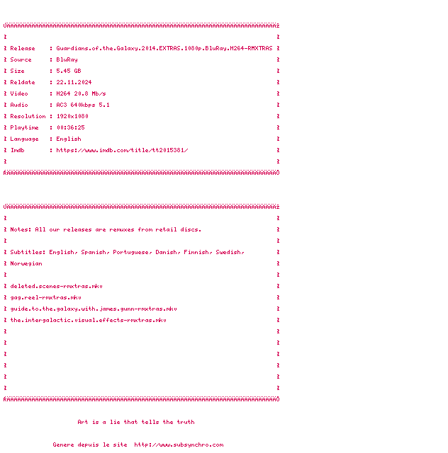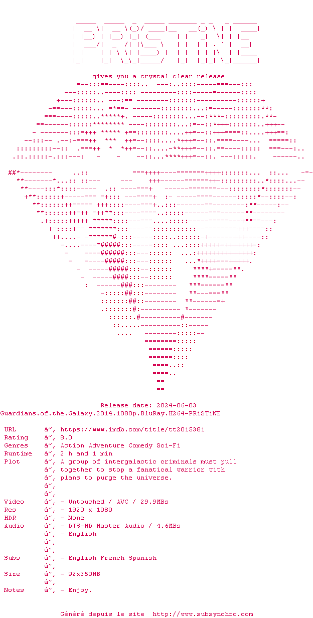 Ce film est culte! graphiquement (les vaisseaux!!), les personnages, les décors, on a l'impression de voir une synthèse de ce qui c'est fait de mieux en sf façon cartoon. C'est l'occasion, pour les amateurs, de voir le docu sur le Dune de Jodorovski; Gardians of the Galaxy est bourré de ce genre de références. Ils ont bien fait leurs devoirs. Une réussite.