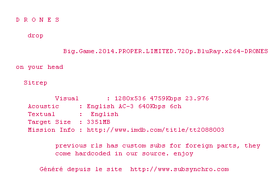 NFO de Big.Game.2014.PROPER.LIMITED.720p.BluRay.x264-DRONES