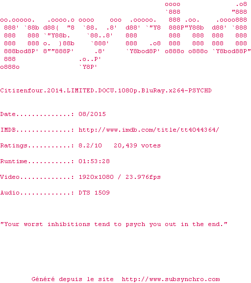 Citizenfour.2014-PSYCHD.srt Ajouté par Hurukan Ajoute le 28-08-2015 16:42:24 Format : SRT Italique : Oui Taille : 0.00Ko Telechargement : 326 Sous-titre Extrait d'un DVD Z2 Merci àMatmanamane. Ajouter cette release à ma collection en cas de telechargement des sous-titres 0 0 0 Telecharger le ZiP contenant NFO, Affiche, Sous-titre (*.srt) Commentez le fichier Citizenfour.2014-PSYCHD.srt Commentez le fichier Citizenfour.2014-PSYCHD.srt Commentez ce fichier Le fichier 2642-1440772944.srt n'existe pas ! Telechargez le RSS « Fichier de la release Citizenfour.2014.LIMITED.DOCU.1080p.BluRay.x264-PSYCHD » Retour a la release « Citizenfour.2014.LIMITED.DOCU.1080p.BluRay.x264-PSYCHD »