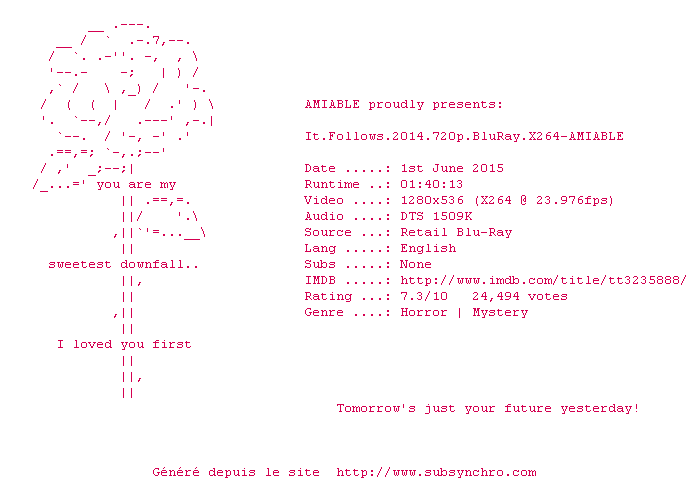 Telechargez le RSS « Fichier de la release It.Follows.2014.720p.BluRay.X264-AMIABLE »