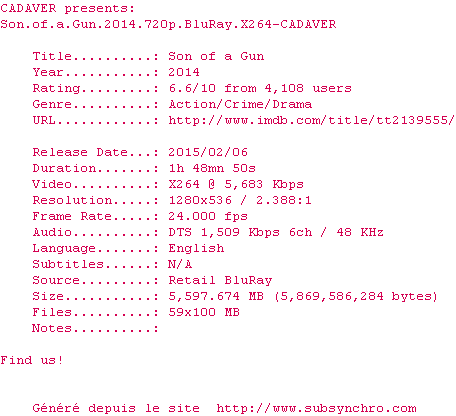 Telechargez le RSS « Fichier de la release Son.of.a.Gun.2014.720p.BluRay.X264-CADAVER »