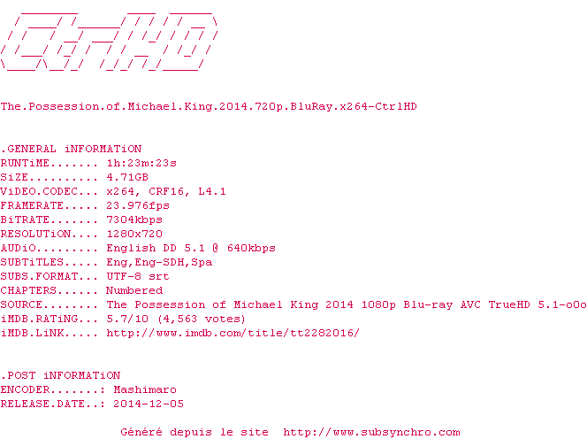 Telechargez le RSS « Fichier de la release The.Possession.of.Michael.King.2014.720p.BluRay.x264-CtrlHD »
