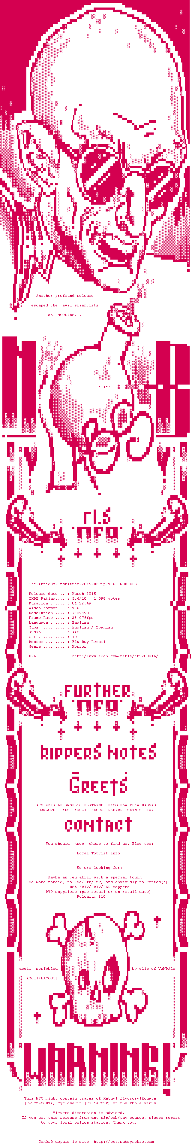 Voir le nfo de la release The.Atticus.Institute.2015.720p.BluRay.x264-NODLABS