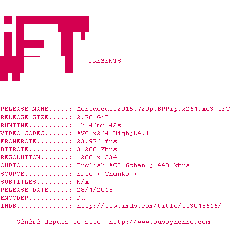 Voir le nfo de la release Mortdecai.2015.720p.BRRip.x264.AC3-iFT