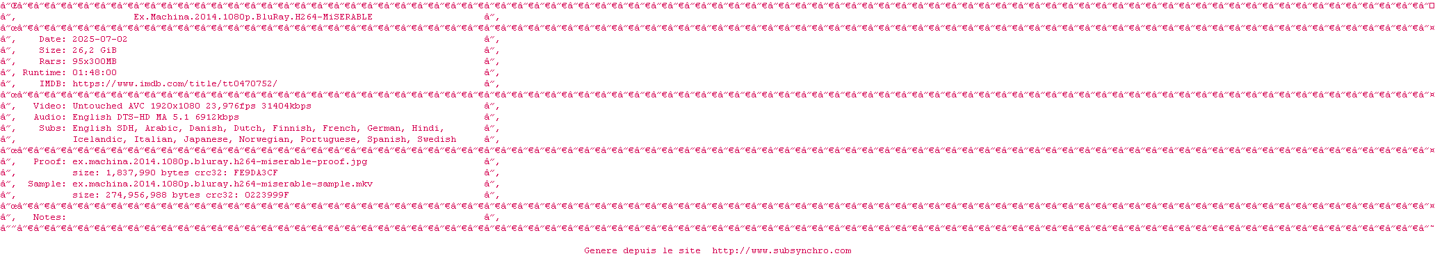 Le commentaire de H le H Commente par H le H (20), Le Lundi 25 Mai 2015 à 20h47 Excellent film de S.F. !! Un huit clos traitant d'I.A. digne d'une chronique d'Asimov (malgré l'absence des 3 lois), le tout dans une superbe ambiance bien pesante ! 9 / 10 2 1