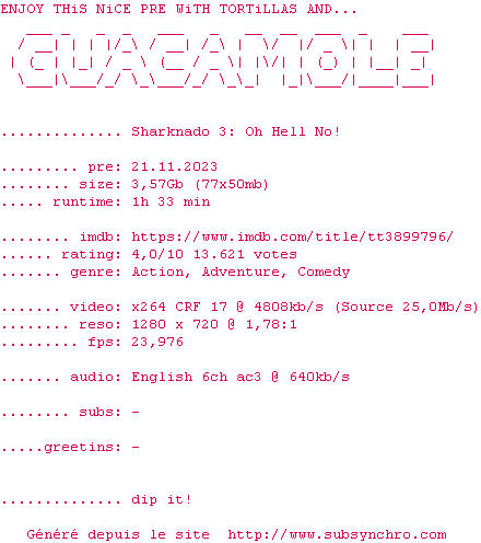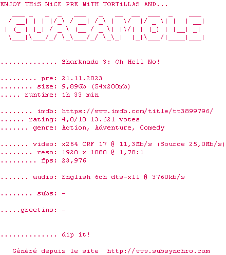 Voir le nfo de la release Sharknado.3.Oh.Hell.No.2015.EXTENDED.720p.BluRay.x264-GUACAMOLE