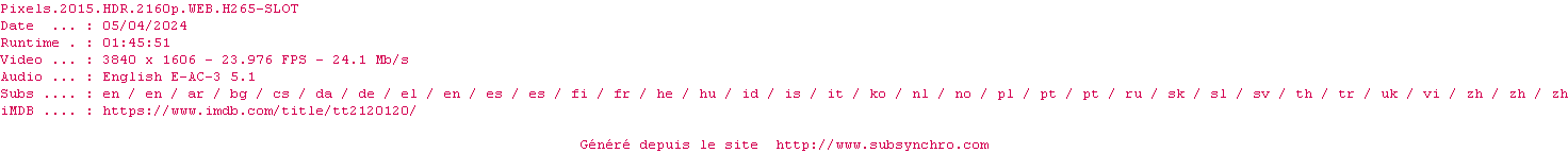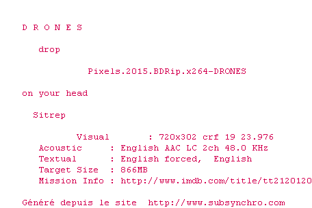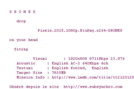 Le commentaire de SubSynchro Commente par SubSynchro (254), Le Jeudi 06 Aout 2015 à 12h26 Le défi de mélanger film et jeu vidéo est plutôt satisfaisante, le film est bourré de 3eme degré et les répliques sont efficaces et pourtant dieu sait que je déteste Adam Sandler. Kevin James est toujours aussi attachant dans ses personnages maladroits ! 8 / 10 2 1