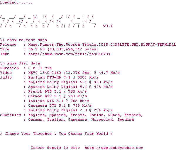 Y avez-vous pense ? Nous proposons déjà 1905 sous-titres pour le film Le Labyrinthe : La Terre brûlée. Avez-vous essaye de voir si ces sous-titres etaient compatibles avec cette release ? On vous laisse le soin de tester cela pour nous et de contribuer au site en postant le sous-titre en cas de compatiblite constatee !