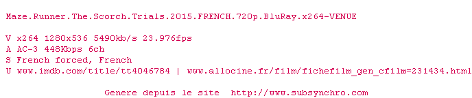 Y avez-vous pense ? Nous proposons déjà 1905 sous-titres pour le film Le Labyrinthe : La Terre brûlée. Avez-vous essaye de voir si ces sous-titres etaient compatibles avec cette release ? On vous laisse le soin de tester cela pour nous et de contribuer au site en postant le sous-titre en cas de compatiblite constatee !