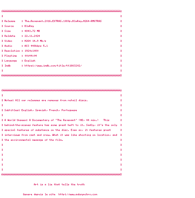 Le commentaire de morfale Commente par morfale (9), Le Dimanche 20 Mars 2016 à 14h55 Il est des films qui se vivent plus qu'ils ne se regardent. Des films aussi agressifs qu'une attaque de grizzli et pourtant tout aussi sublimes que les paysages enneigés de l'Ouest américain. Des films où le perfectionnisme du réalisateur sublime chaque plan et où l'intensité de l'interprétation est implacable telle une aveugle soif de vengeance. Des films qui transcendent l'abominable beauté de l'âme humaine et laisse des traces aussi éclatante qu'une tâche de sang sur un sol enneigé. THE REVENANT fait indéniablement partie de ces films-là . 10 / 10 3 1