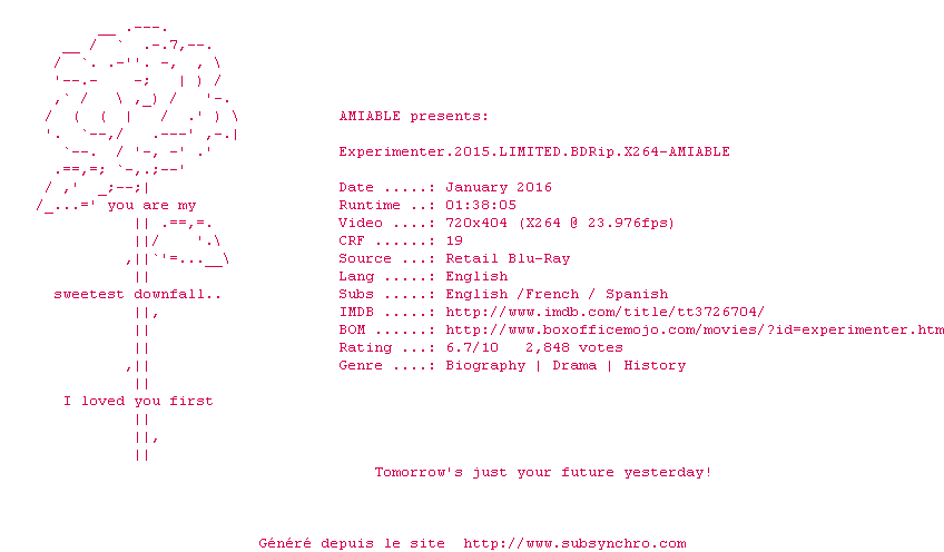 Voir le nfo de la release Experimenter.2015.LIMITED.720p.BluRay.x264-AMIABLE
