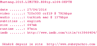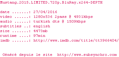 Voir le nfo de la release Mustang.2015.LIMITED.1080p.BluRay.x264-DEPTH