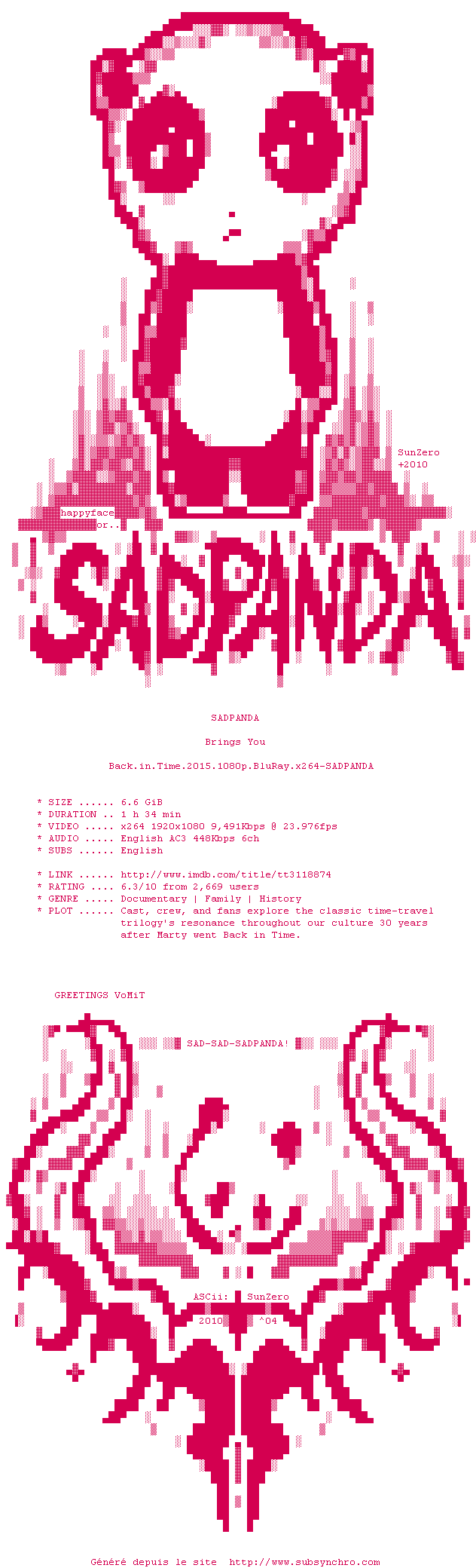 | Voir le nfo de la release Back.In.Time.2015.1080p.BluRay.x264-SADPANDA | SADPANDA | Back.In.Time.2015.1080p.BluRay.x264-SADPANDA OpenSubtitles | 0 fichier |