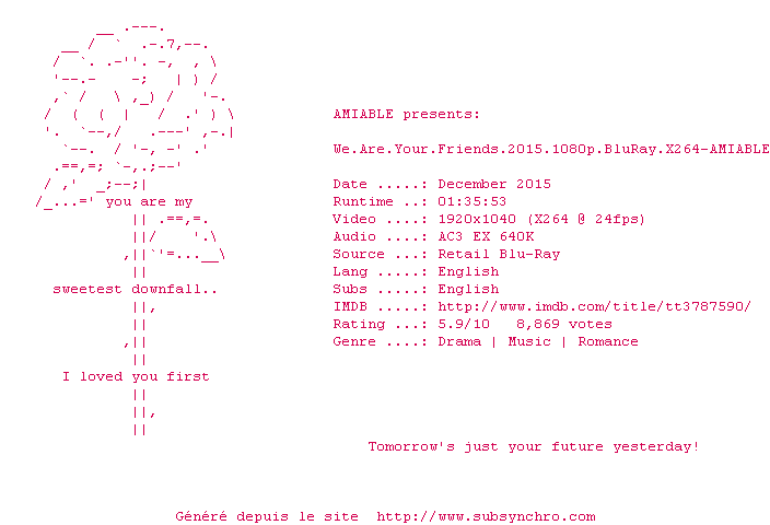 Voir le nfo de la release We.Are.Your.Friends.2015.1080p.BluRay.x264-AMIABLE