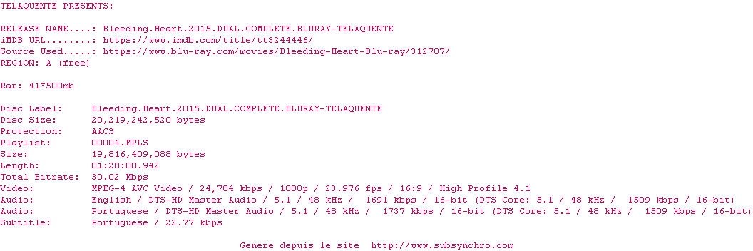 | Voir le nfo de la release Bleeding.Heart.2015.DUAL.COMPLETE.BLURAY-TELAQUENTE | TELAQUENTE | Bleeding.Heart.2015.DUAL.COMPLETE.BLURAY-TELAQUENTE OpenSubtitles | 0 fichier |