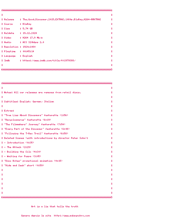 Le commentaire de rridan44 Commente par rridan44 (19), Le Jeudi 11 Fevrier 2016 à 23h14 un bon pixar plein d'émotions et d'humour dans le même esprit que UP!(la haut),normale même équipe pour la réalisation 8 / 10 0 0