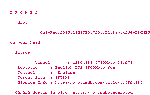 | DRONES | Chi-Raq.2015.LIMITED.BDRip.x264-DRONES OpenSubtitles | 0 fichier | |||