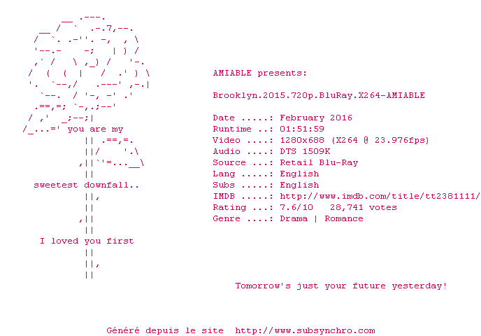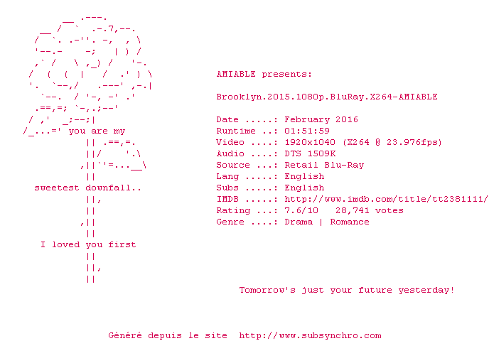 Voir le nfo de la release Brooklyn.2015.1080p.BluRay.x264-AMIABLE