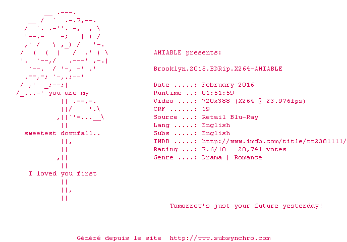 Voir le nfo de la release Brooklyn.2015.BDRip.x264-AMIABLE