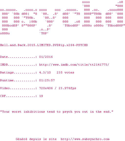 Voir le nfo de la release Hell.And.Back.2015.LIMITED.DVDRip.x264-PSYCHD