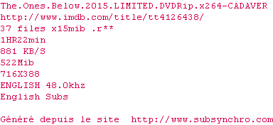 Voir le nfo de la release The.Ones.Below.2015.LIMITED.DVDRip.x264-CADAVER