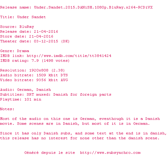 Voir le nfo de la release Under.Sandet.2015.DANiSH.720p.BluRay.x264-RCDiVX
