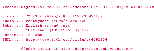 | Voir le nfo de la release Arabian.Nights.Volume.II.The.Desolate.One.2015.BDRip.x264-BiPOLAR | BiPOLAR | Arabian.Nights.Volume.II.The.Desolate.One.2015.BDRip.x264-BiPOLAR OpenSubtitles | 0 fichier | ||