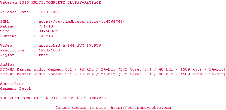 Voir le nfo de la release Veteran.2015.MULTI.COMPLETE.BLURAY-RATPACK