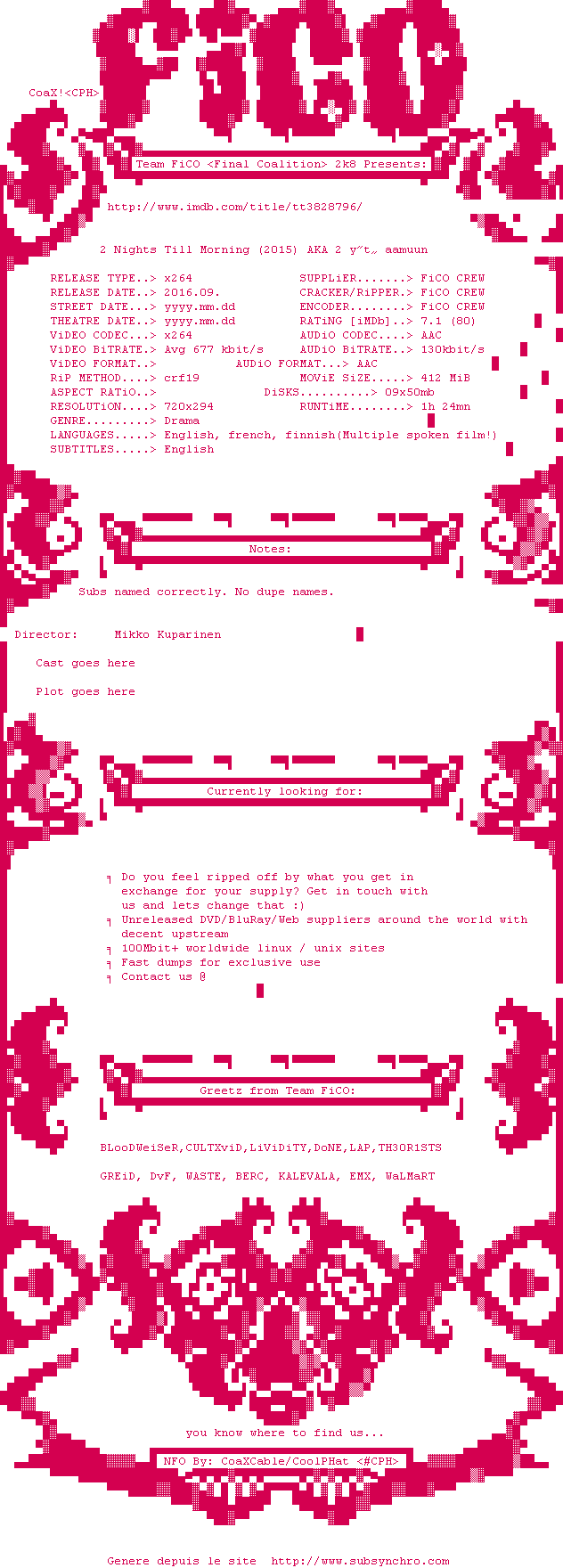| FiCO | 2.Nights.Till.Morning.2015.DVDRip.x264-FiCO OpenSubtitles | 0 fichier | |||