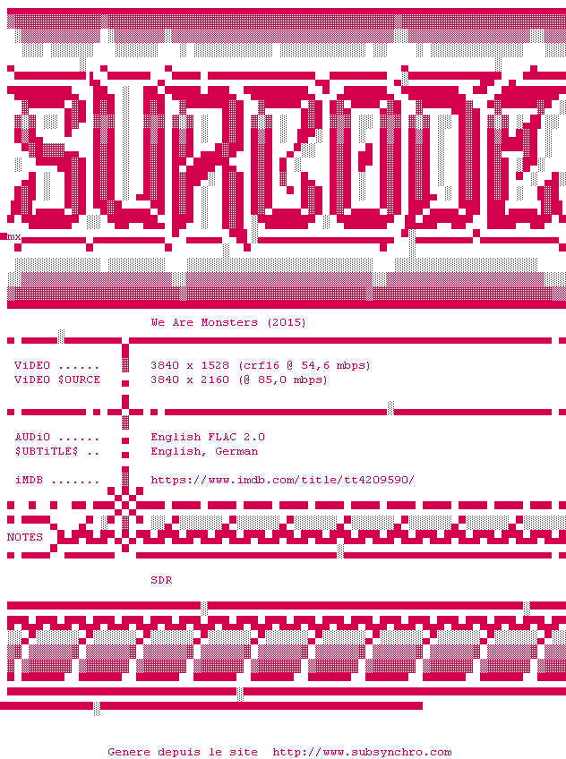 Voir le nfo de la release We.Are.Monsters.2015.2160p.UHD.BluRay.x265-SURCODE