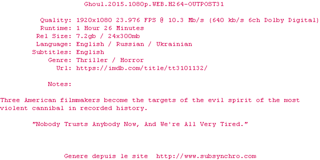 Y avez-vous pense ? Nous proposons déjà 2124 sous-titres pour le film Ukrainian Cannibal. Avez-vous essaye de voir si ces sous-titres etaient compatibles avec cette release ? On vous laisse le soin de tester cela pour nous et de contribuer au site en postant le sous-titre en cas de compatiblite constatee !