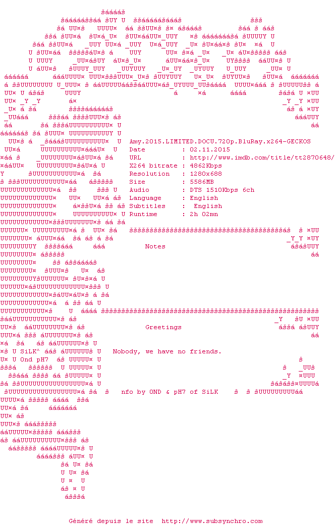 Y avez-vous pense ? Nous proposons déjà 1389 sous-titres pour le film Amy. Avez-vous essaye de voir si ces sous-titres etaient compatibles avec cette release ? On vous laisse le soin de tester cela pour nous et de contribuer au site en postant le sous-titre en cas de compatiblite constatee !