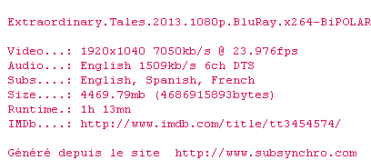 Telechargez le RSS « Fichier de la release Extraordinary.Tales.2013.1080p.BluRay.x264-BiPOLAR »
