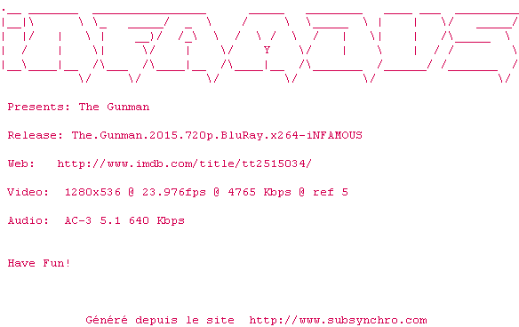 Telechargez le RSS « Fichier de la release The.Gunman.2015.720p.BluRay.x264-iNFAMOUS »