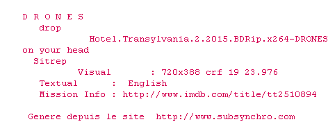 Telechargez le RSS « Fichier de la release Hotel.Transylvania.2.2015.BDRip.x264-DRONES »
