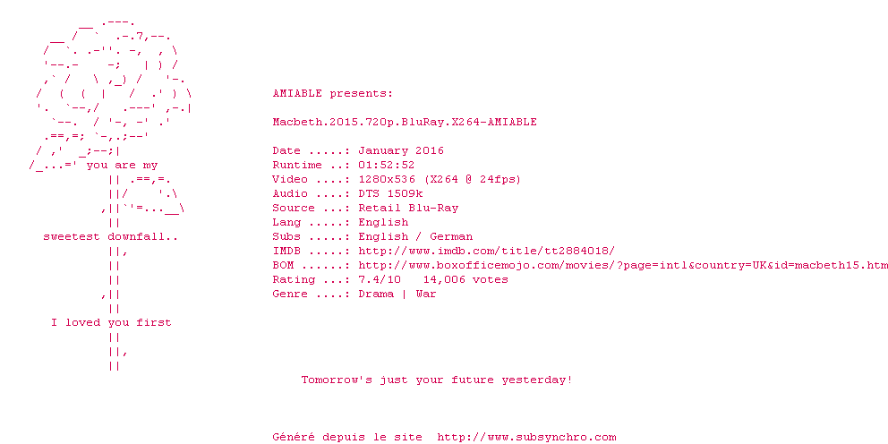 Telechargez le RSS « Fichier de la release Macbeth.2015.720p.BluRay.x264-AMIABLE »