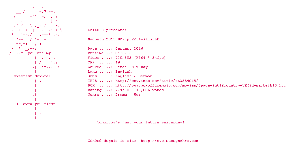 Telechargez le RSS « Fichier de la release Macbeth.2015.BDRip.x264-AMIABLE »