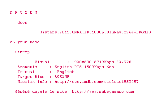 Telechargez le RSS « Fichier de la release Sisters.2015.UNRATED.1080p.BluRay.x264-DRONES »