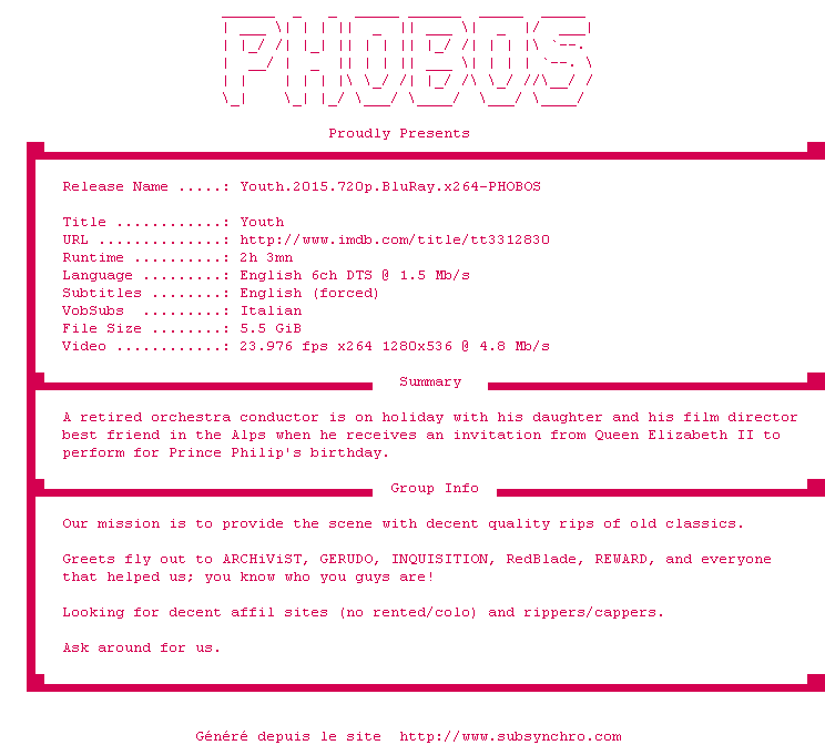 Youth.2015.720p.BluRay.x264-PHOBOS.srt Ce fichier a été testé et validé par Stank07 Ajouté par Stank07 Ajoute le 15-11-2015 17:06:52 Format : SRT Italique : Non Taille : 0.00Ko Telechargement : 251 Testé par le membre Ajouter cette release à ma collection en cas de telechargement des sous-titres 0 0 0 Telecharger le ZiP contenant NFO, Affiche, Sous-titre (*.srt) Commentez le fichier Youth.2015.720p.BluRay.x264-PHOBOS.srt Commentez le fichier Youth.2015.720p.BluRay.x264-PHOBOS.srt Commentez ce fichier Le fichier 10452-1447603612.srt n'existe pas ! Telechargez le RSS « Fichier de la release Youth.2015.720p.BluRay.x264-PHOBOS » Retour a la release « Youth.2015.720p.BluRay.x264-PHOBOS »