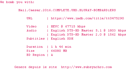Y avez-vous pense ? Nous proposons déjà 1051 sous-titres pour le film Ave César !. Avez-vous essaye de voir si ces sous-titres etaient compatibles avec cette release ? On vous laisse le soin de tester cela pour nous et de contribuer au site en postant le sous-titre en cas de compatiblite constatee !