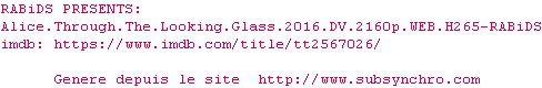 Voir le nfo de la release Alice.Through.The.Looking.Glass.2016.DV.2160p.WEB.H265-RABiDS