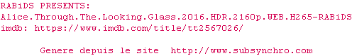 Voir le nfo de la release Alice.Through.The.Looking.Glass.2016.HDR.2160p.WEB.H265-RABiDS