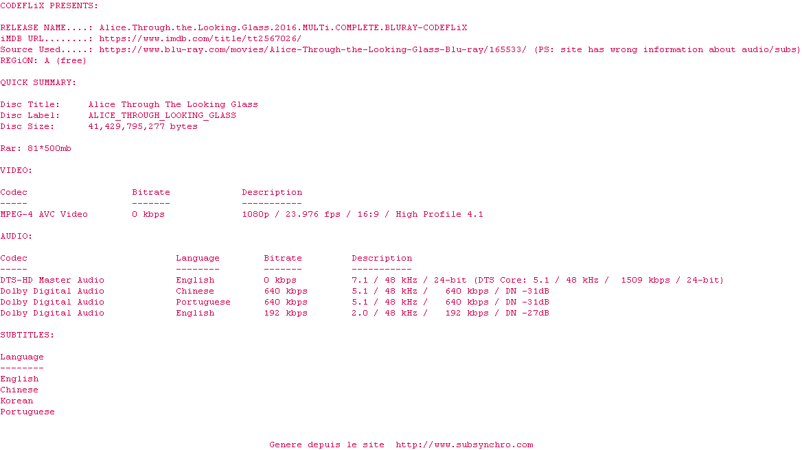 Voir le nfo de la release Alice.Through.The.Looking.Glass.2016.MULTi.COMPLETE.BLURAY-CODEFLiX