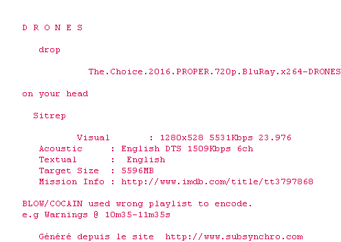 Voir le nfo de la release The.Choice.2016.PROPER.720p.BluRay.x264-DRONES