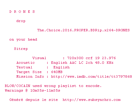 Voir le nfo de la release The.Choice.2016.PROPER.1080p.BluRay.x264-DRONES