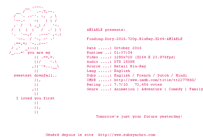 Le commentaire de SubSynchro Commente par SubSynchro (340), Le Mercredi 29 Juin 2016 à 19h25 13 ans après et on a l'impression que c'était hier ! Le film (vu en français) est juste génial ! On apprend pleins de trucs sur Dory (Forcement), ce qui enrichie encore plus ce personnage si attachant ! Le film est aussi drôle pour les petits que pour les grands. 10 / 10 1 0