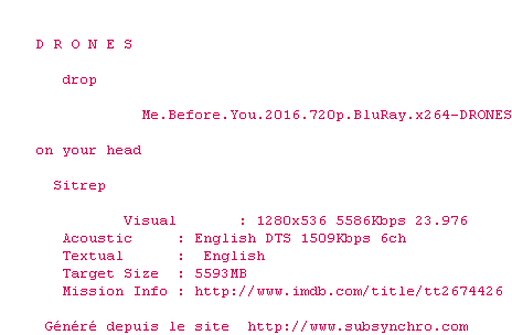 Voir le nfo de la release Me.Before.You.2016.BDRip.x264-DRONES
