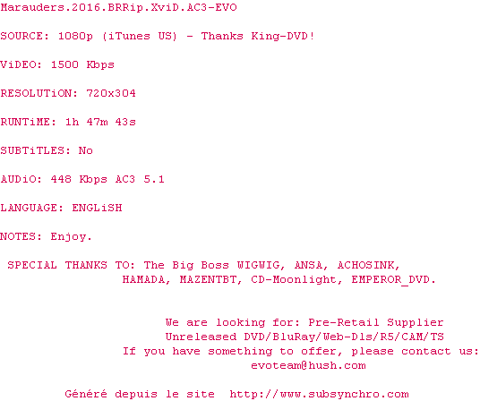 | Voir le nfo de la release Marauders.2016.BRRip.XviD.AC3-EVO | EVO | Marauders.2016.BRRip.XviD.AC3-EVO OpenSubtitles | 0 fichier | ||
