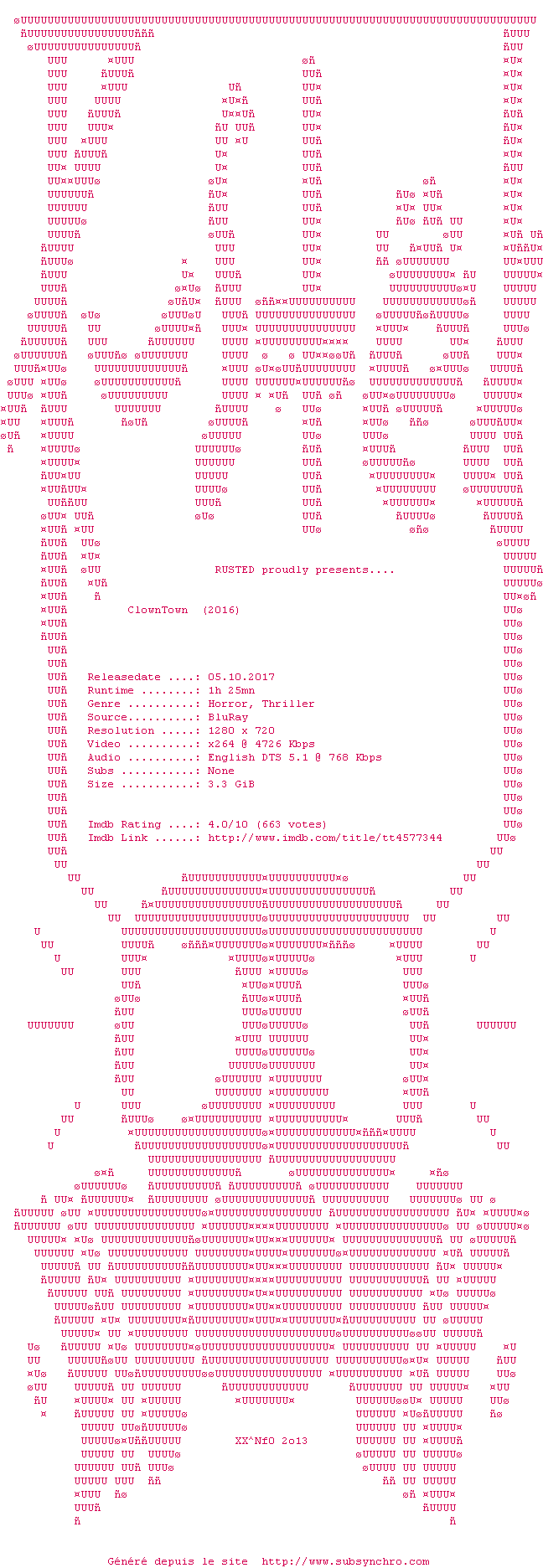 | Voir le nfo de la release ClownTown.2016.720p.BluRay.x264-RUSTED | RUSTED | ClownTown.2016.720p.BluRay.x264-RUSTED OpenSubtitles | 0 fichier |