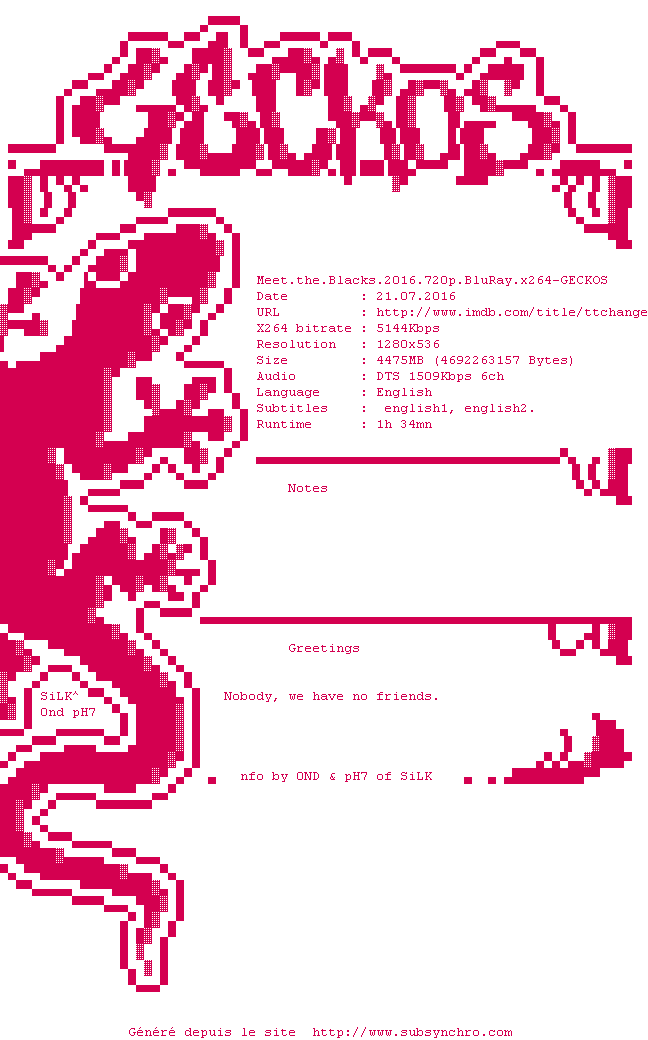 Voir le nfo de la release Meet.The.Blacks.2016.BDRip.x264-GECKOS